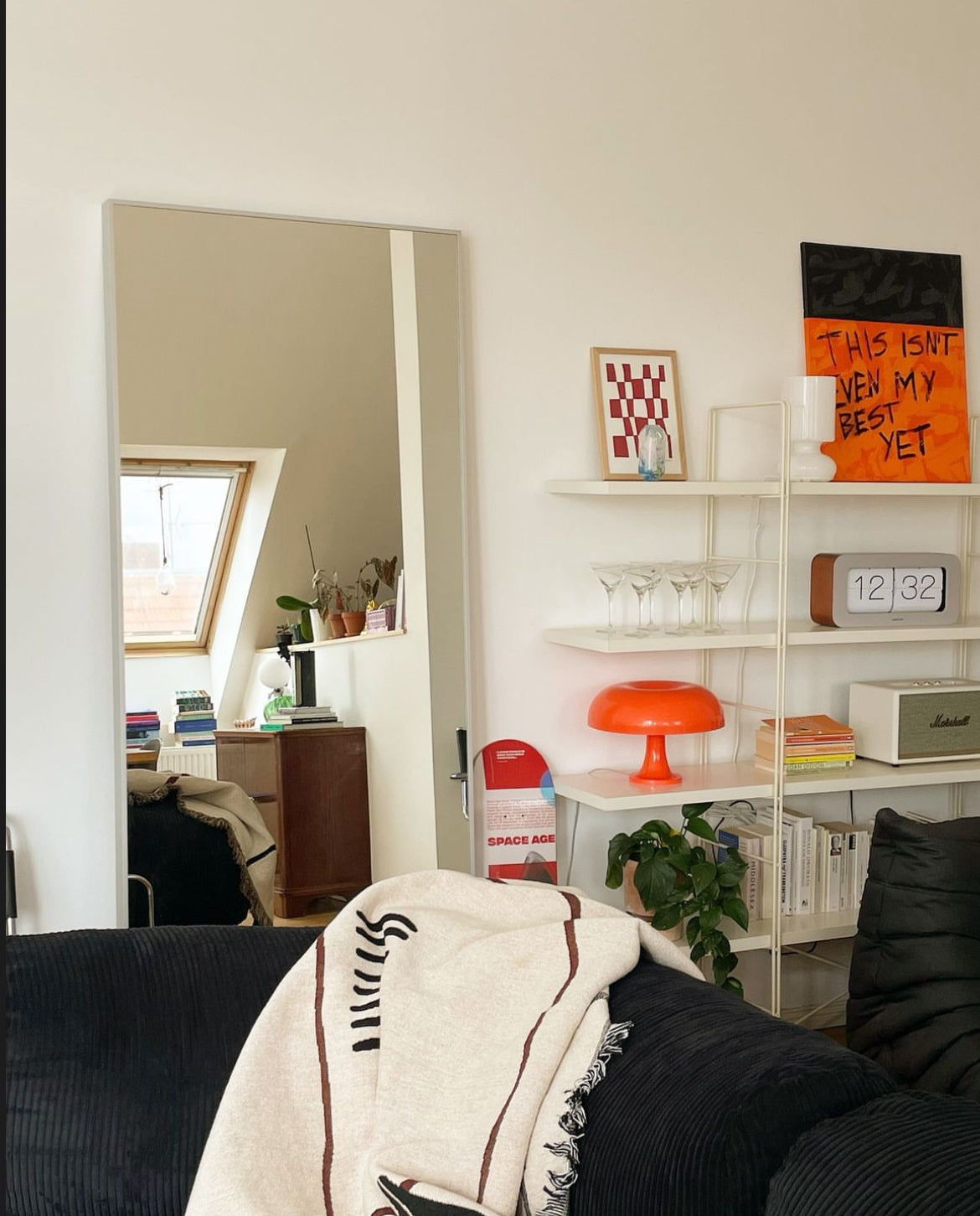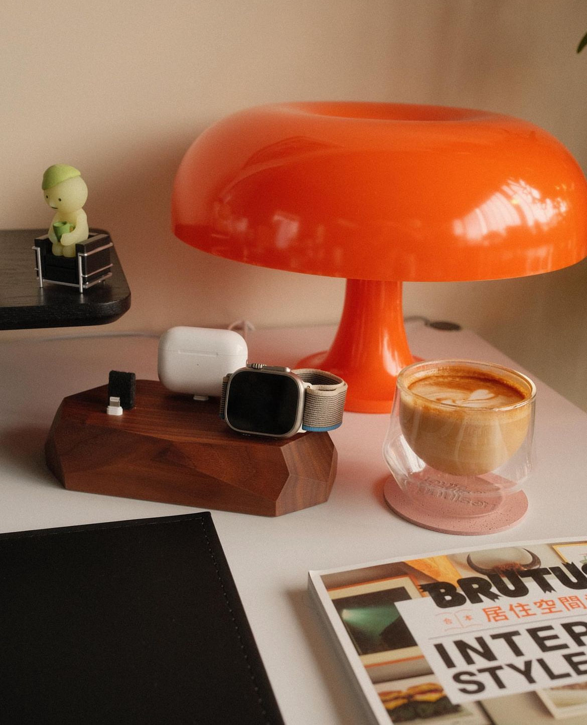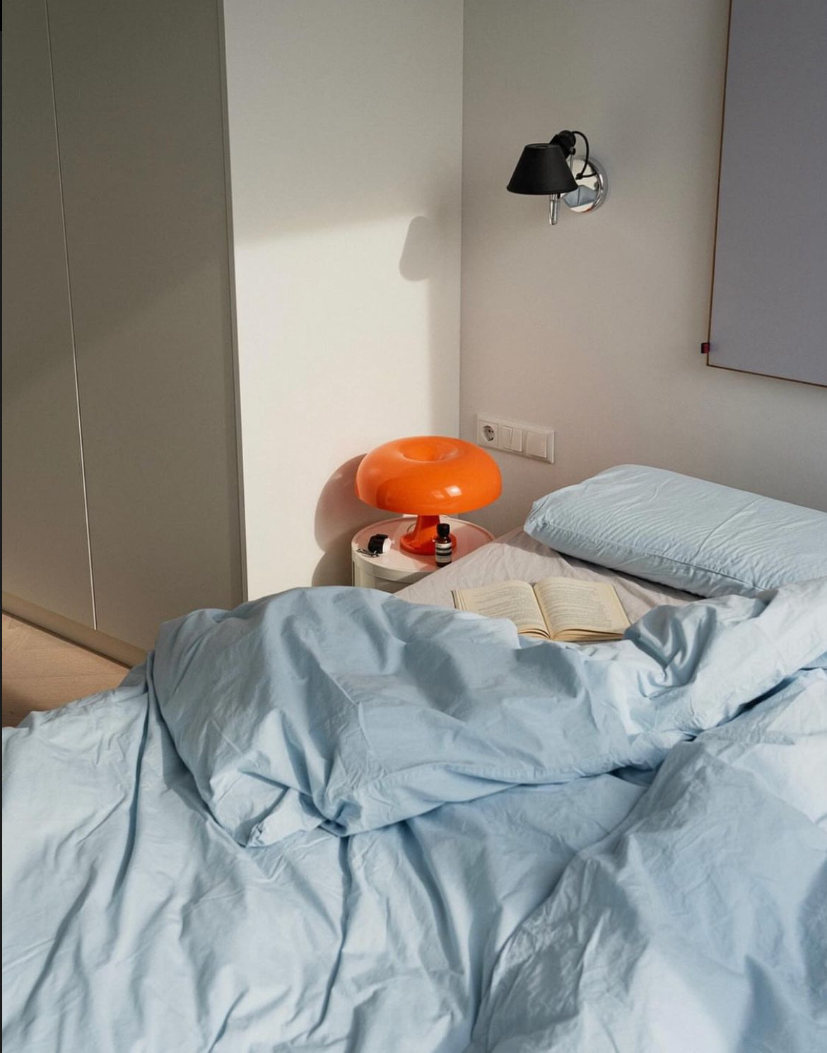 This table lamp stands out with its futuristic and organic style, featuring a mushroom-shaped base and a molded plastic shade.